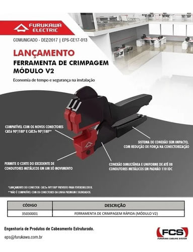 - O Alicate Para Crimpagem V2 é uma ferramenta projetada para proporcionar uma crimpagem eficiente e sem impacto, ideal para profissionais que precisam de rapidez e precisão na instalação de conectores keystone. Este alicate oferece uma crimpagem uniforme que melhora a performance e reduz a força necessária, garantindo uma conexão segura e eficiente. Permite a conexão simultânea de até oito condutores metálicos isolados em terminais de conexão padrão 110 IDC e também o corte do excedente de condutores metálicos. O design da ferramenta favorece a economia de tempo durante o processo de conectorização, embora não seja compatível com conectores blindados ou da linha Premium. A ferramenta é compatível com conectores fêmea U/UTP Cat.5e Multilan 90/180 e é apresentada em uma embalagem blister de plástico/papelão nas cores preto e vermelho.