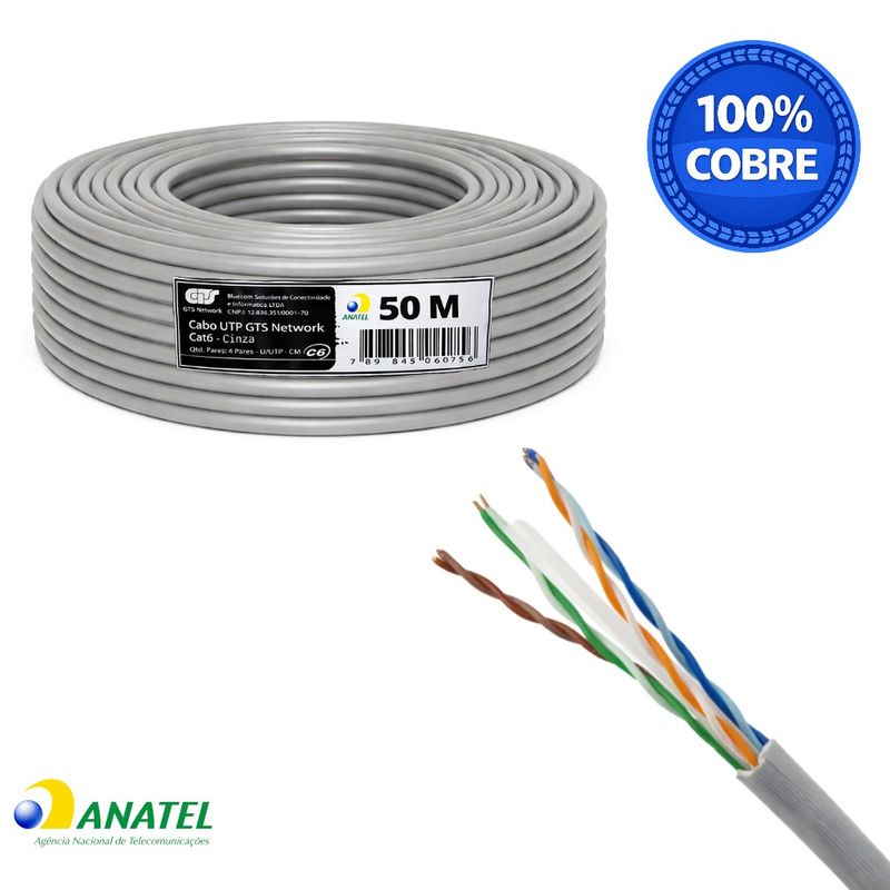 Cabo de Rede Cat6 U/UTP CM Cinza Rolo com 50,0 Metros