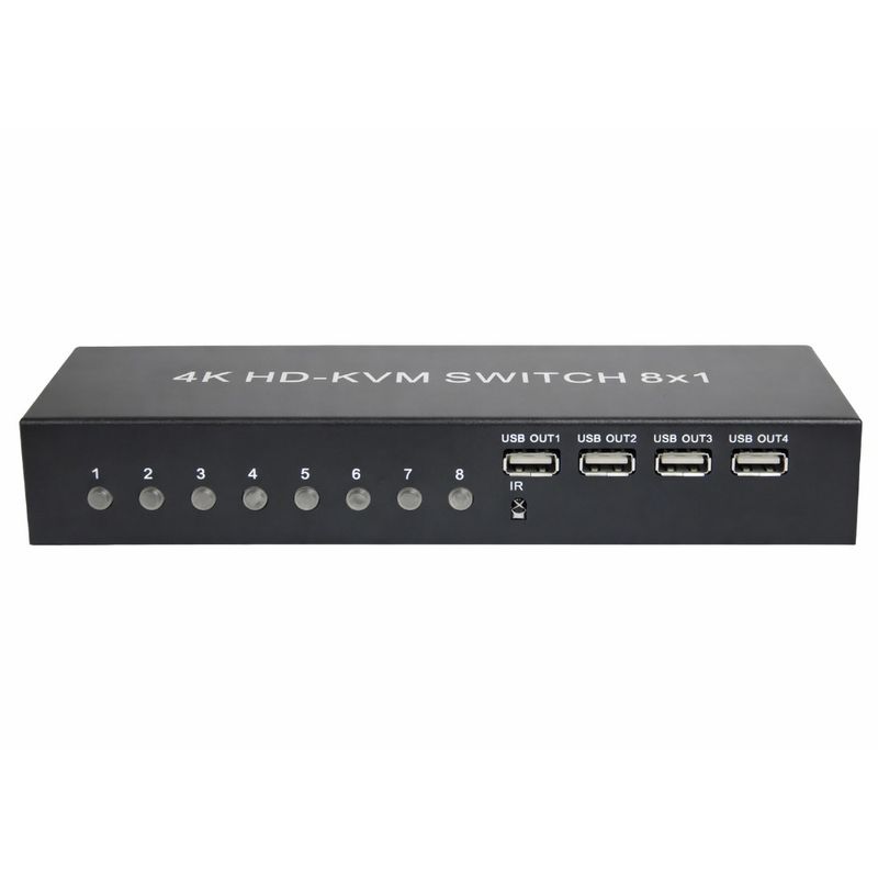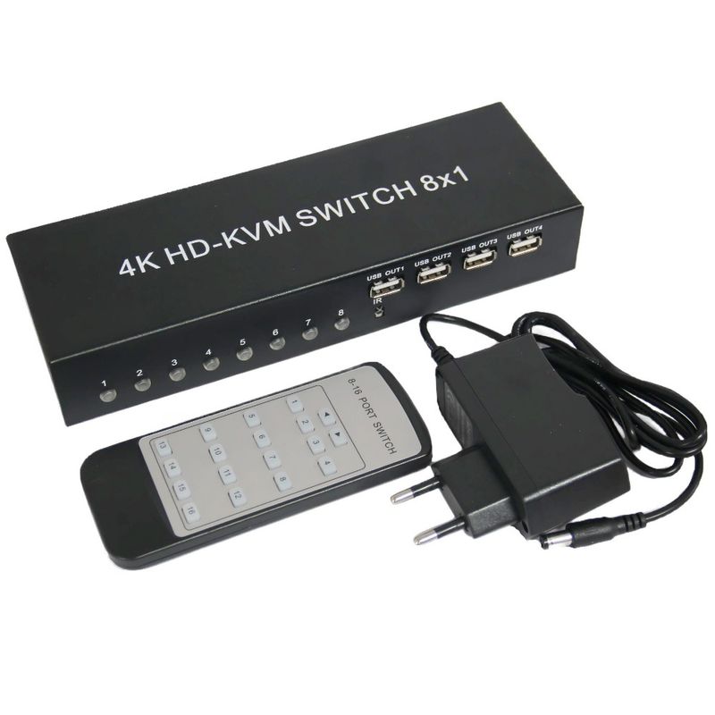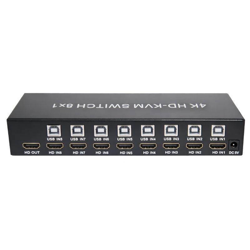 - O Chaveador Switch KVM HDMI 4K 8 Portas é a solução ideal para quem precisa controlar até oito computadores ou dispositivos HDMI utilizando apenas um monitor, teclado e mouse. Com suporte a resolução 4K a 30Hz, o equipamento garante transmissão de áudio e vídeo em alta definição, com qualidade estável e sem perdas.