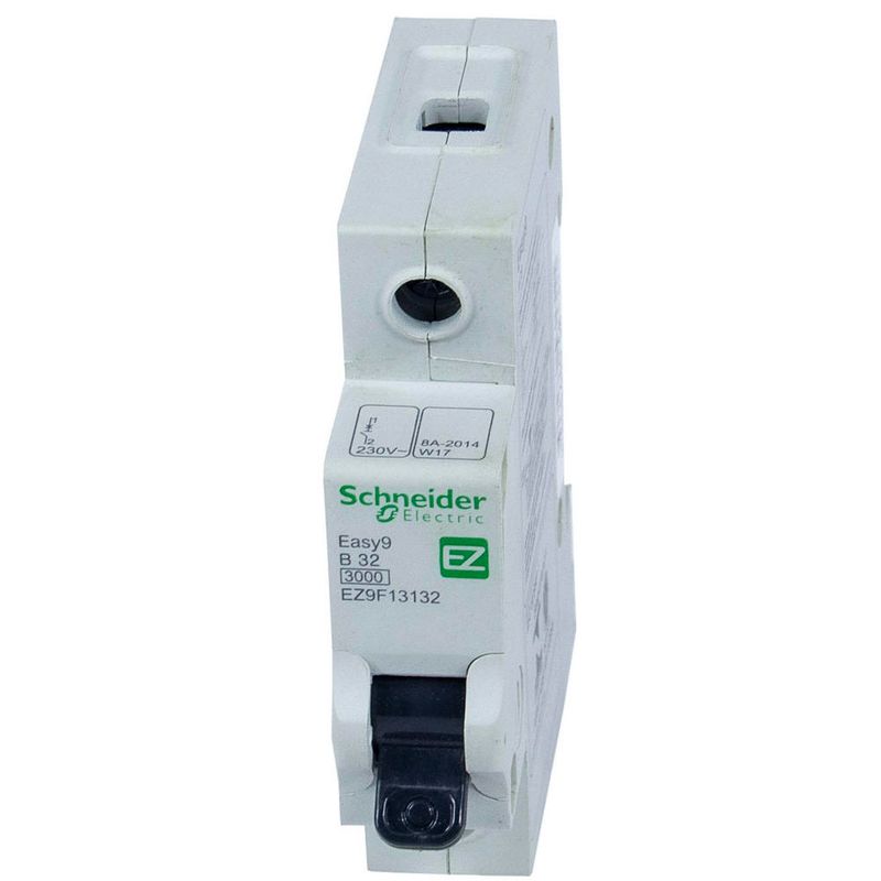 - Disjuntor 32A termomagnético Easy9 EZ9F13132, 1 pólo, disjuntor 32A amperes no máximo a 230Vca, associa as funções de proteção contra sobrecorrentes (sobrecargas e curtos-circuitos) e seccionamento dos circuitos elétricos em instalações elétricas residenciais, respondendo as necessidades com um produto robusto e realizando instalações confiáveis e seguras e suporte de montagem em trilho DIN que permite uma instalação mais rápida e segura.