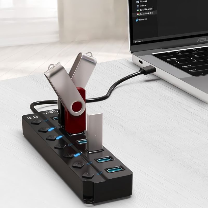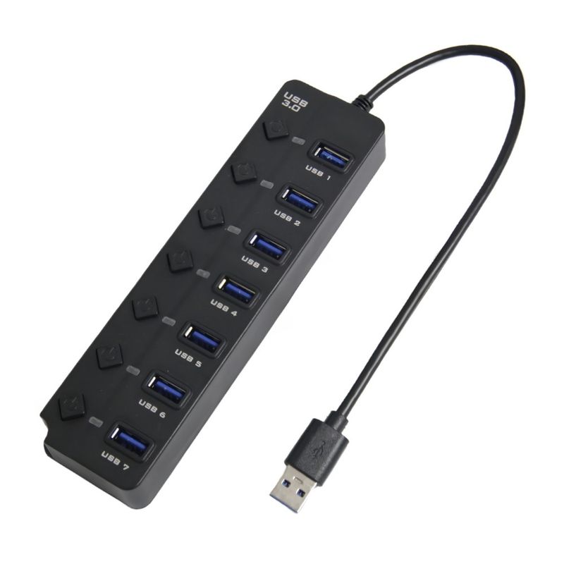 - O Hub USB 3.0 de 7 portas com função Liga e Desliga é uma solução versátil e conveniente para expandir as capacidades de conectividade de seus dispositivos. Com sete portas USB 3.0 de alta velocidade, oferece uma maneira fácil de conectar múltiplos dispositivos, como Notebooks, desktops, tablets e outros dispositivos compatíveis, aleém de contar com a opção de alimentação de energia 5V, que permite a utilização de HD e/ou SSD que necessitam de uma voltagem maior para trabalhar em seu máximo desempenho.