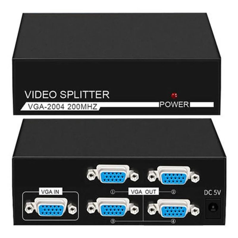 - O Splitter VGA 1X4 conta com uma fonte que alimenta a placa interna, assim o aparelho aguenta cabos de maiores distâncias.